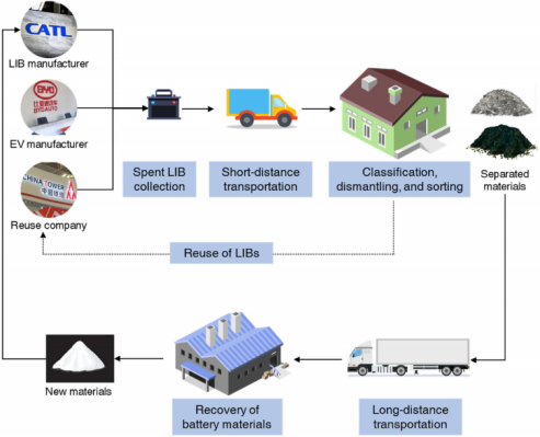 然而,低效的回收模式仍然限制了产业链的发展。目前,废旧动力LIBs往往被收集起来直接运往回收公司进行回收利用。由于废旧LIBs还储存着电能,它们的运输通常是危险的。此外,电池回收地点通常离回收公司很远,过高的运费也会抵消一部分电池回收的利润。