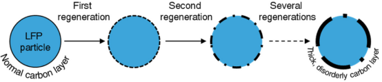 多次再生后,LFP颗粒表面形成了厚而无序的碳层(图片来源:eTransportation)