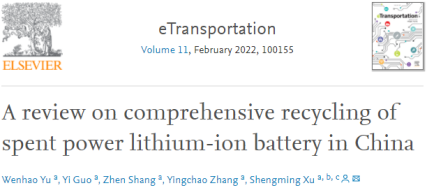 Yu W, Guo Y, Shang Z, et al. A review on comprehensive recycling of spent power lithium-ion battery in China[J]. eTransportation, 2022: 100155.