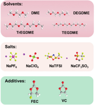 醚基电解液中常用的盐包括NaPF6、NaClO4、NaTFSI、NaCF3SO3和NaBF4。
