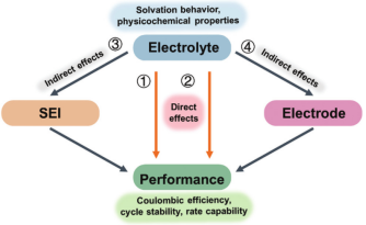 我们对电解液影响电池性能的四种途径进行了分类,如下图所示。电解液可以通过其固有的物理化学性质和参与电化学反应(路径1和2)直接影响电池的性能。此外,电解液还可以通过影响SEI和电极(路径3和4)来间接影响电池的性能。
