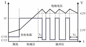 当电池电压上升到上限截止电压(4.25 V)后再进行脉冲充电:用1 C的脉冲电流间歇地对电池充电。脉冲充电时电池电压不断升高,充电停止后电压慢慢降低。当电池电压降低到上限截止电压(4.25 V)后,以同样的电流值对电池再次充电,直到电池电量充满为止。