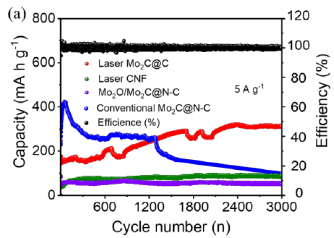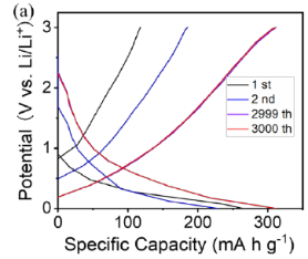 由上图可知,作者对不同锂电负极材料组装的电池进行了3000个循环的充放电循环,电流密度为5 A/g。