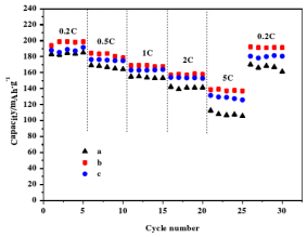由上图可知,作者在5个不同电流密度下对电池进行了充放电,最后回到初始的最小电流0.2 C(为了得出电池在大倍率循环后是否发生了结构变化等不可逆因素而导致电池失效)。