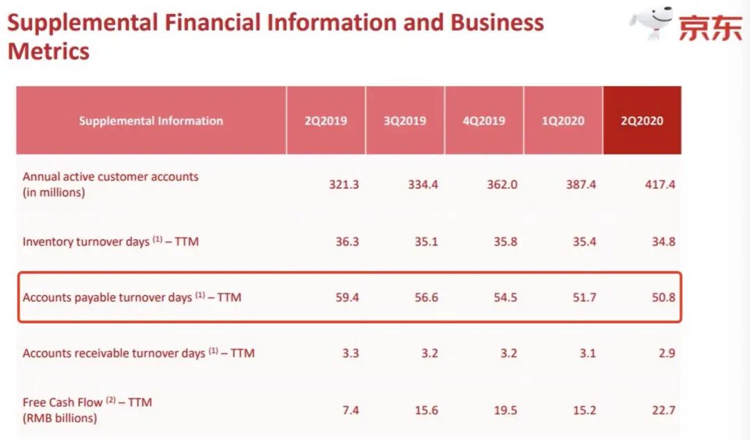关键的是,京东这些现金流的增长并没有通过以往的“手段”——拉长应付账款周期来解决。财报显示,过去5个季度的京东的应付账款周期分别为59.4天,56.6天,54.5天,51.7天,50.8天,每个季度都在递减。