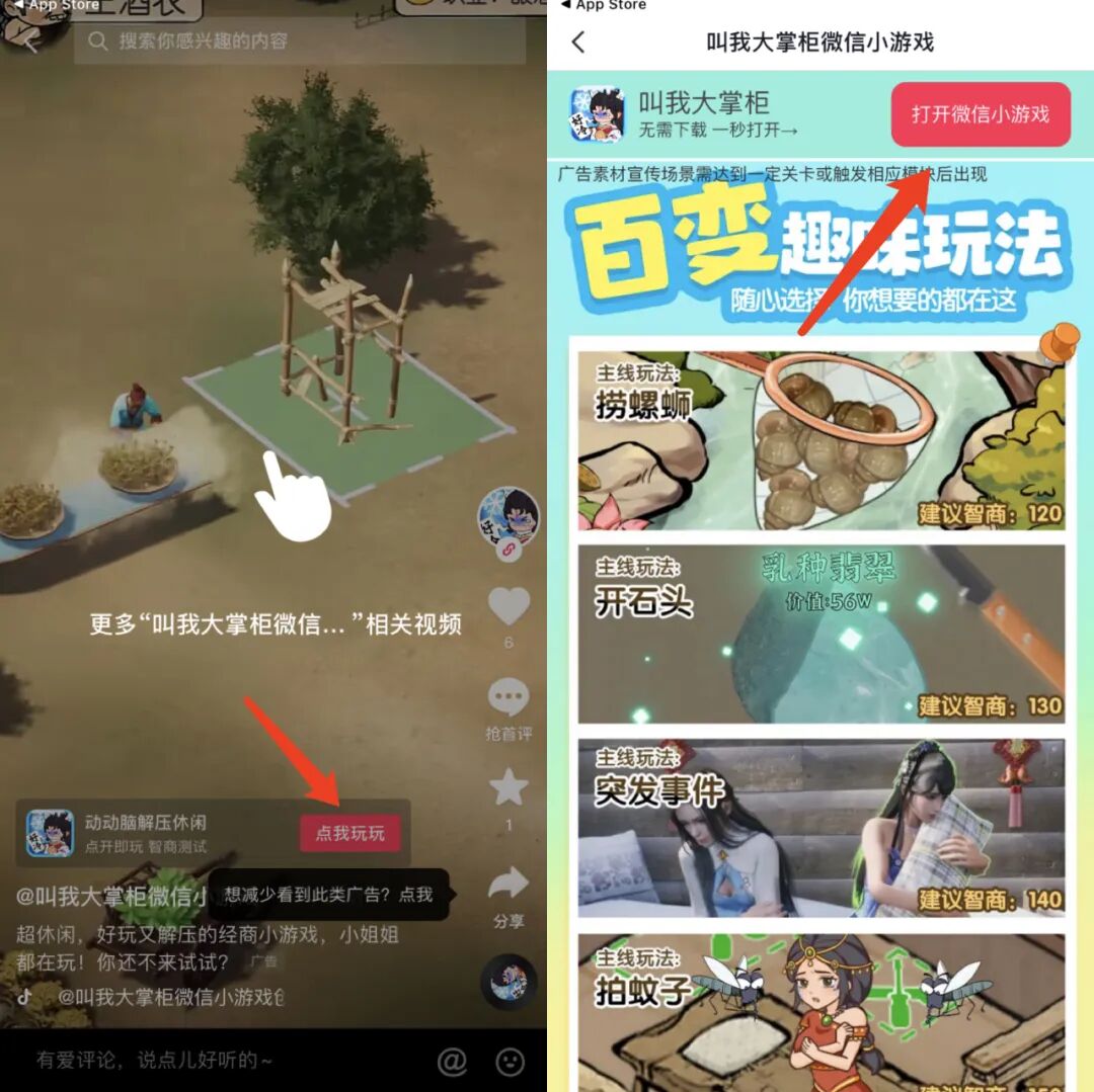 现在,用户在刷抖音的过程中,时常会被推荐微信小游戏的广告。点击广告上的“点我玩玩”按钮,可获得微信小游戏的广告介绍页面,再点击一次醒目红色标识,即可直接从抖音跳转到微信小游戏。抖音中可以直接搜索并跳转的这类微信小游戏包括《叫我大掌柜》《英雄盟约》《山海经异变》《爱琳诗篇》《异兽擎天》《别惹三国》《雄霸乱世》等。