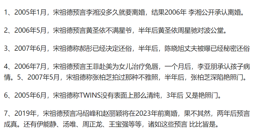 关于宋德祖这个名字,很多人非常陌生,但曾有网友统计,宋祖德曾多次发出预言,被他说中的语言则高达22个,其中就有黄圣依和星爷闹掰、林生斌事件等等。
