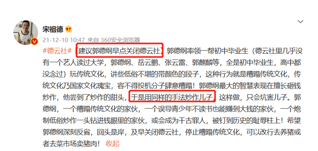 还说德云社的人都没什么文化,他说的相声也是糟蹋中国文化,郭德纲甚至还炒作自己的儿子。
