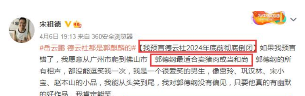 2021年4月6日,“预言家”宋祖德突然发布微博:我预言德云社2024年前彻底倒闭。