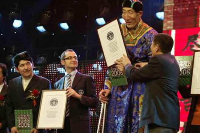在欢呼声中,来自中国内蒙古,身高2.361米的鲍喜顺接下了“世界自然生长第一高人吉尼斯世界纪录证书”。