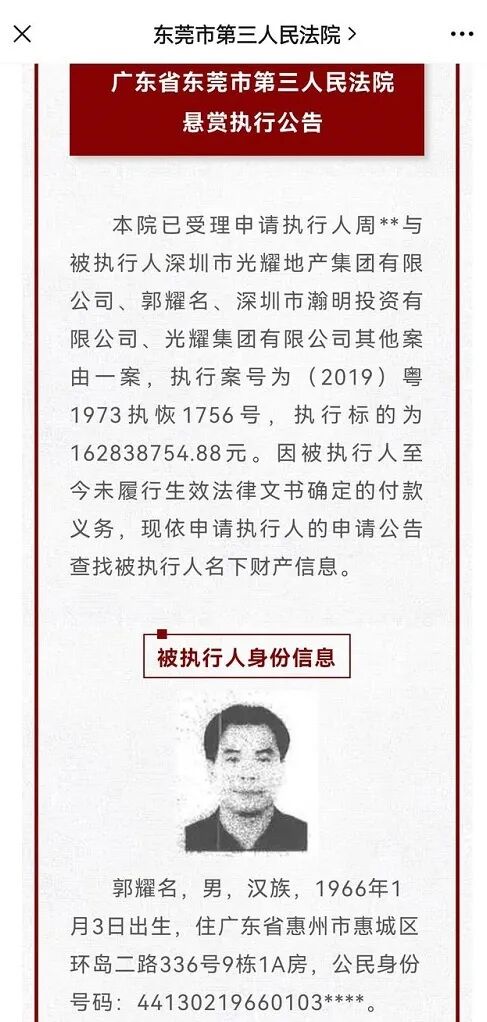 而当初信誓旦旦还要从头再来的郭耀名早已奔赴香港,法院不得不发出了“悬赏令”,寻找郭耀名及其其合法财产的下落,悬赏金高达160万元。
