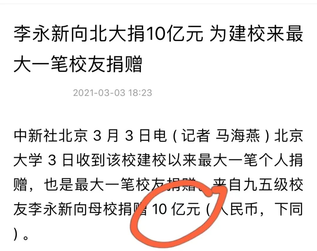 其实,之前李永新也给北大捐过款,1000万、一亿。这一次,他又捐了10亿元。