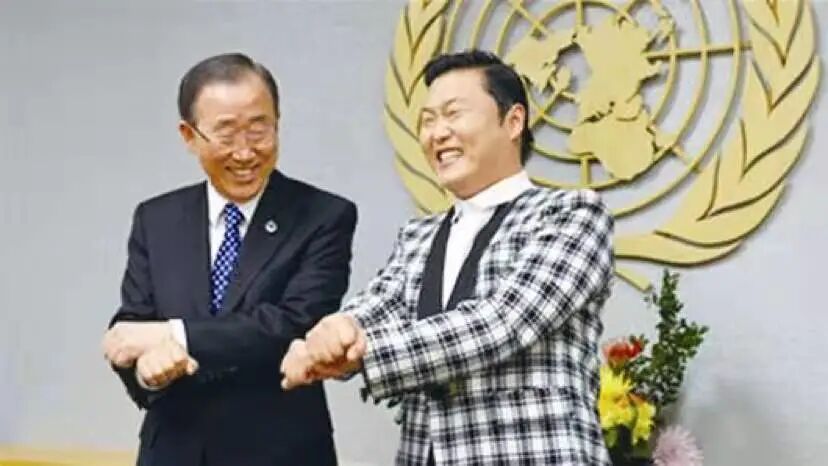 联合国秘书长潘基文逮到鸟叔在纽约演出,专程邀请他到联合国总部大楼,然后跟鸟叔学跳骑马舞;