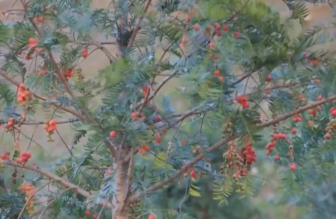 红豆杉,被誉为“植物大熊猫”,它的树皮含有抗癌物质,成材做成家具坚实耐用,是国家一级珍稀保护树种,只是它的生长速度缓慢,从小树苗长成大树大概需要几十年,甚至上百年。
