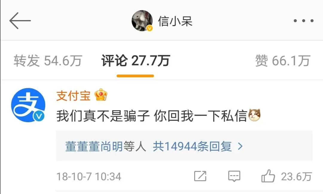 直到看到支付宝官方账号给她微博留言:我们真不是骗子,你回我一下私信;