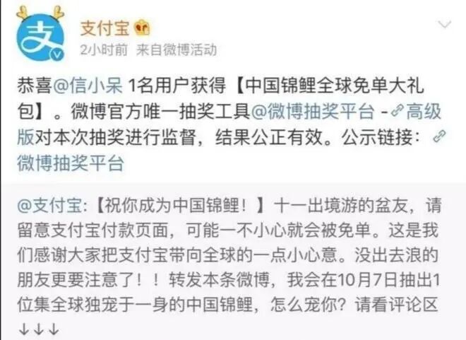 2018年10月7日,她是支付宝公布的“中国锦鲤”微博抽奖的唯一获奖者。