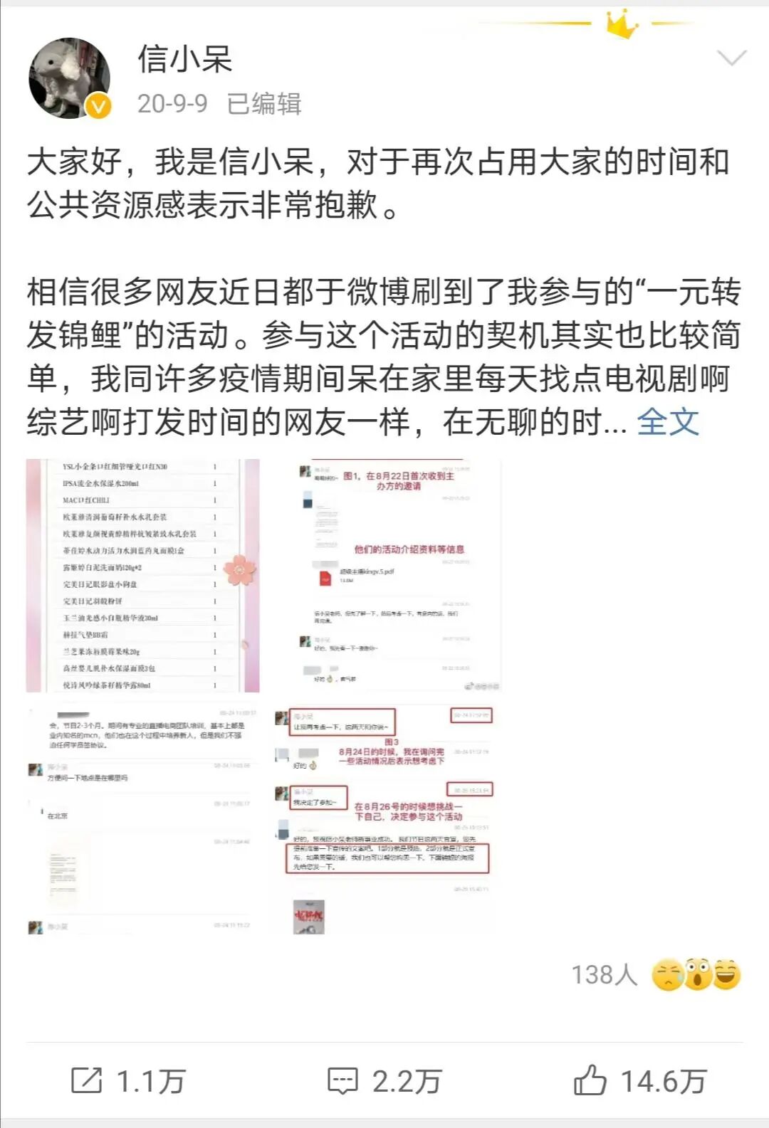 合作方出事了,信小呆也脱不了干系,第二天她郑重做出道歉,并解释因为自己经验尚浅,才犯了这种错误,愿自费五万调整抽奖活动。