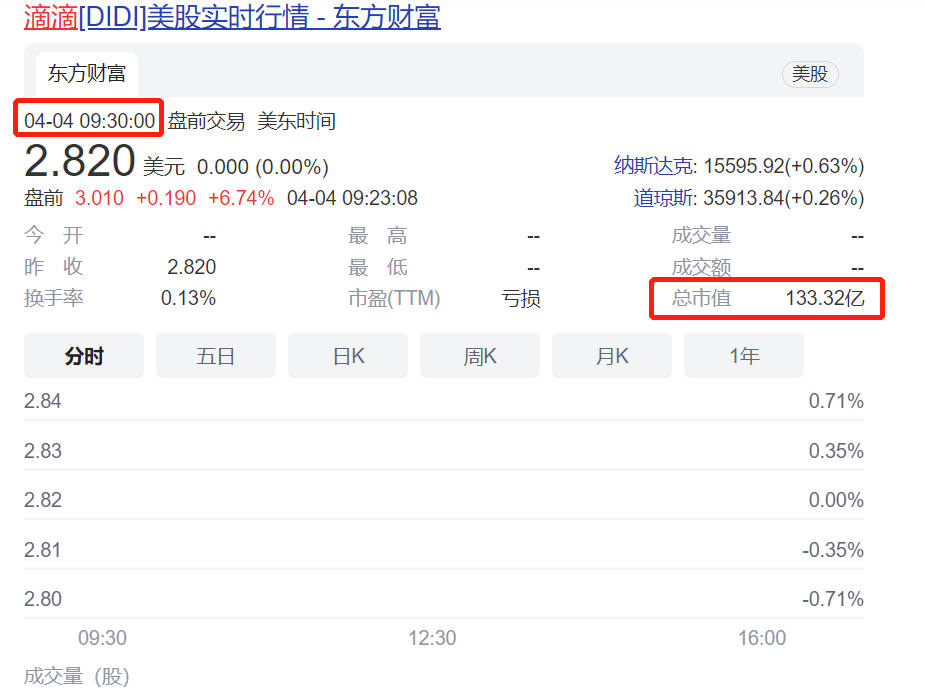 截至4月4号,滴滴出行市值仅剩133亿多美元。