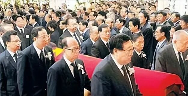 中央的木棺被鲜艳的五星红旗覆盖着,香港当年的一干政要全数出席,首富李嘉诚、香港特别行政区第一任行政长官董建华等响当当的大人物,亲自抬棺扶灵。