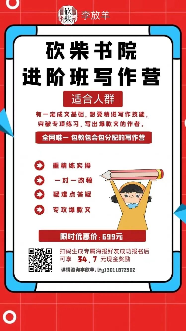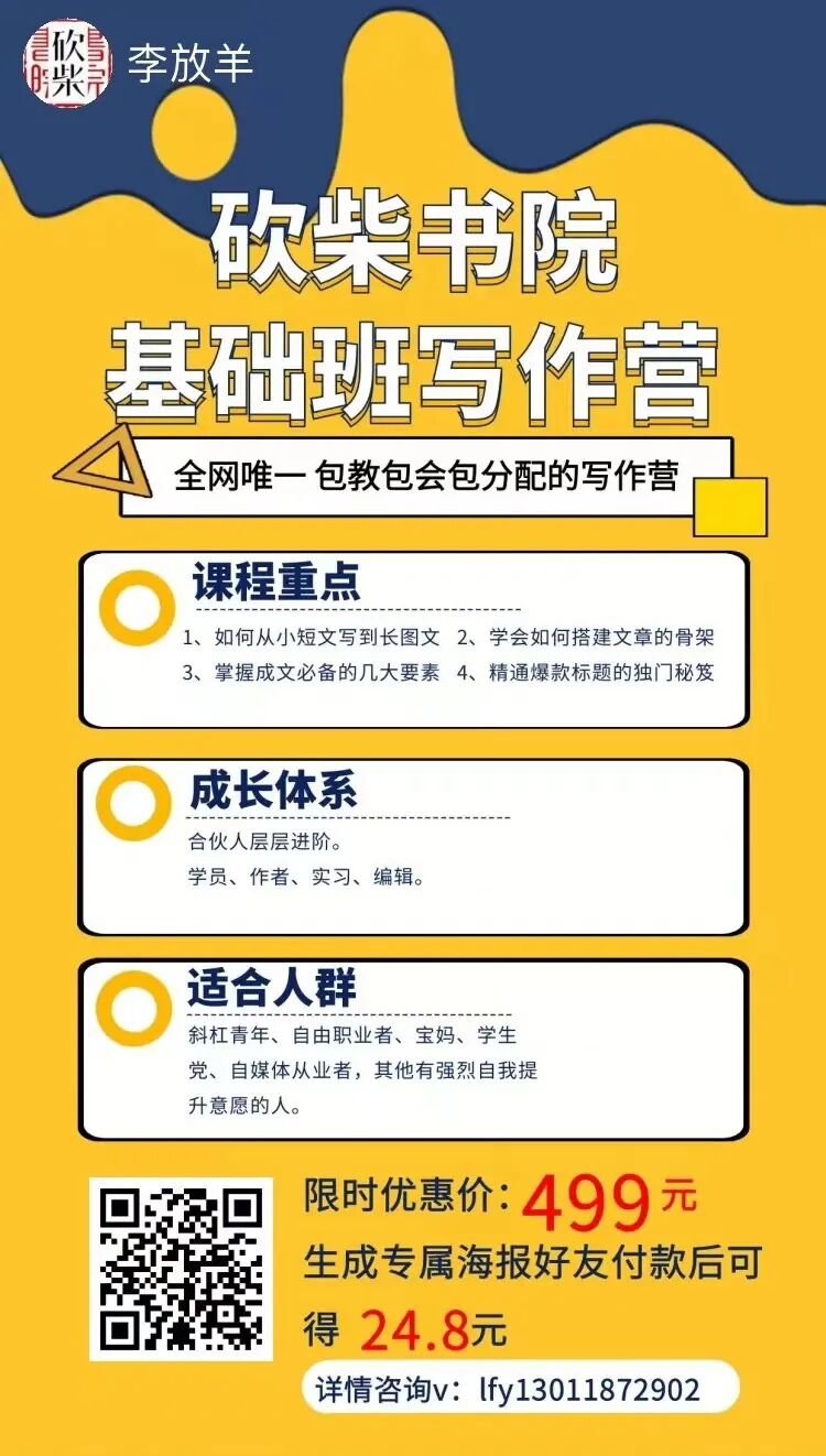 砍柴书院的基础班,帮助你完成从小短文到长图文的成长进步。拆分文章结构,实现各个击破,夯实长文基础的同时,帮你开启爆款按钮。