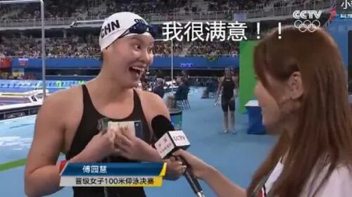 赛后接受采访时,傅园慧说:“58秒95?我以为是59秒,我有这么快?我很满意?”说这些话时,傅园慧表情极度夸张,她难以相信刚刚在泳池里所发生的一切。