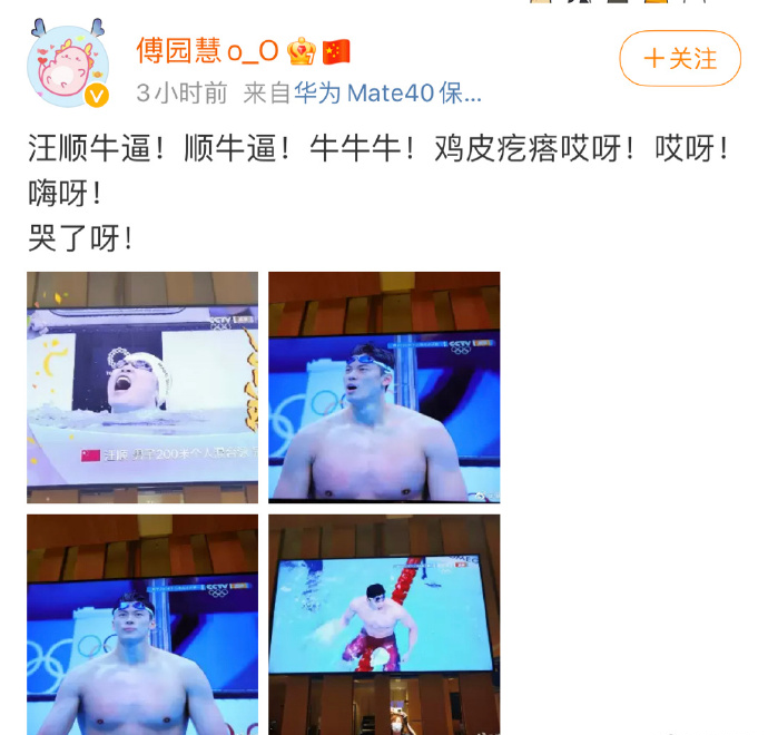 随后,傅园慧激动发文祝贺:”汪顺牛逼!汪顺牛逼!鸡皮疙瘩哎呀!哎呀!嗨呀呀!”