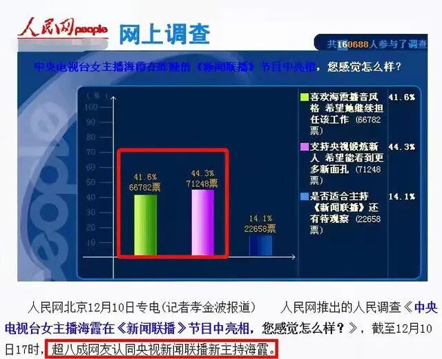 开播24天后,人民网做了一次关于“海霞亮相《新闻联播》,您感觉怎样?”的调查。