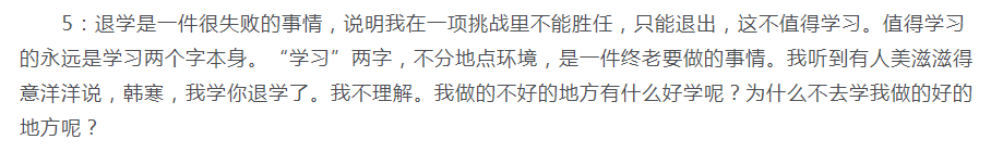 2018年年初,韩寒第一次在采访中直面自己当年的退学经历,他说:“退学是一件很失败的事情,说明在一项挑战里不能胜任,只能退出,这不值得学习。”