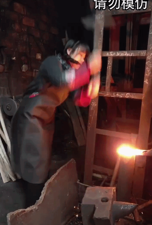 都说女孩子没有什么力气,就连打铁这事,心宝咬上一根麻花辫,便开始一顿猛干。