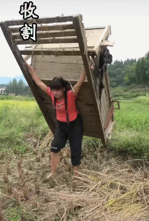 而心宝通过短视频,给我们最大的感受就是真诚。虽然是一个女孩子,但是干活毫不含糊,比她高的打谷机,说背就背。