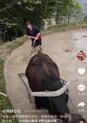 4月的时候,心宝穿着棉裤在田地里牵牛犁田的视频火了,播放量达到1700万,24小时涨粉30万,高兴的心宝一晚上都睡不好觉。