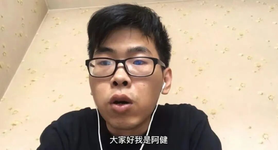 视频中的阿健,有着浓密的头发,戴着黑框眼镜,精神饱满地做着自我介绍,看起来就像一个正常人。