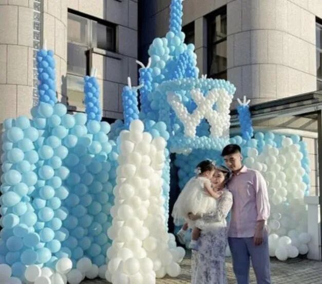 豪宅门口蓝白汽球搭建的超大城堡前,何超盈眉眼含笑地抱着穿白纱公主裙的女儿,依偎在丈夫身边,场景温馨暖人,又充满童话气息。