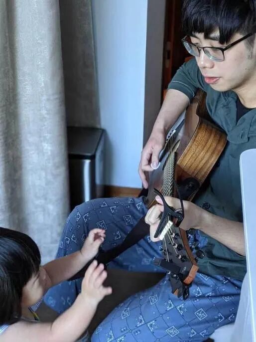 在何超盈晒出的日常生活照中,辛奇隆抱着吉他在家里浅吟低唱,女儿长着胖乎乎的小手在爸爸膝前嬉戏,场面温馨有爱。