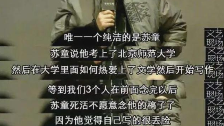 等轮到苏童的时候,他死活不上去了,苏童原本想说的是自己热爱文学,但听了前面三个人的理由,他觉得自己写得太丢脸了。
