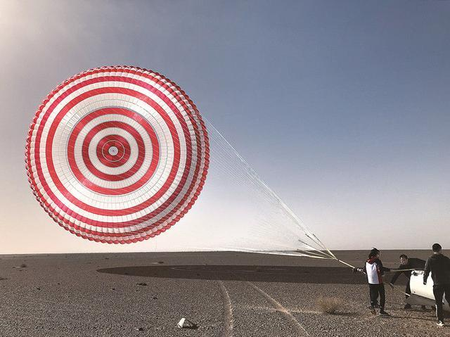 主伞的面积非常之庞大,大概是1200平方米,现如今在我们国内来看,它是航天器当中最大的一个降落伞。这个主伞的张开方式分成两级,打开之后可以将三吨重的返回舱降速到七八米每秒,之后再静静等候,等到它到达地面一米高度左右的时候,就开启反推发动机,最后实现软着陆。