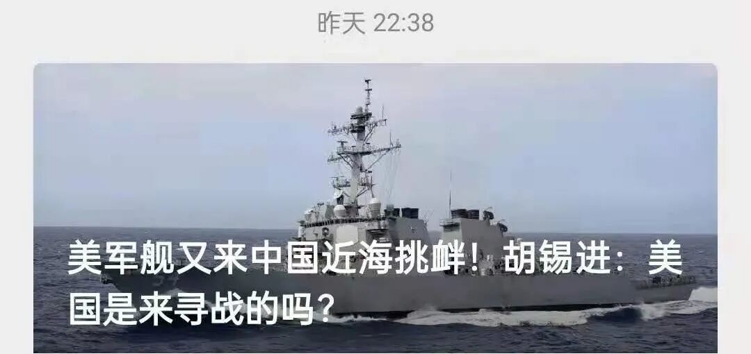 针对美军的挑衅,胡锡进在微信评论的标题是“美国是来寻战的吗?”,然后他进行了一番胡氏论证——说话没有根据,也缺乏逻辑。