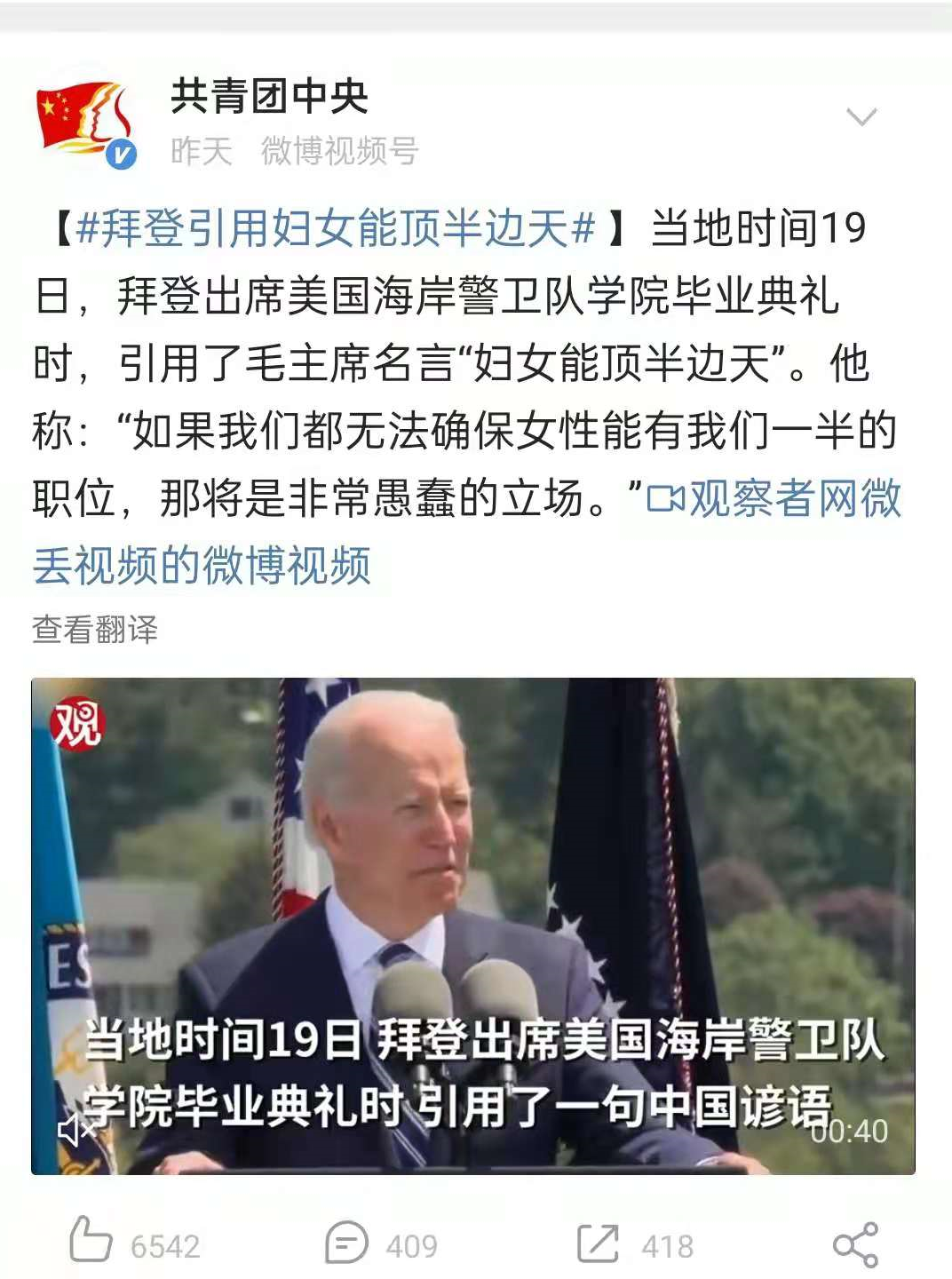 本周三,美国总统拜登出席美国海岸警卫队学院毕业典礼时,引用了一句毛主席名言,“妇女能顶半边天”。此事引起了一些人的自嗨,大呼“天下谁人不通共”,并且称拜登为“拜振华”。