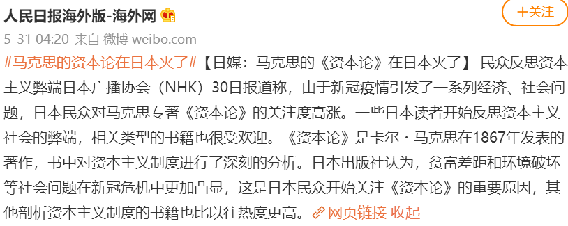 5月30日,日本NHK报道日本民众对马克思专著《资本论》的关注度高涨。一些日本读者开始反思资本主义社会的弊端。日本出版社认为,贫富差距和环境破坏等社会问题在新冠危机中更加凸显,这是日本民众开始关注《资本论》的重要原因,其他剖析资本主义制度的书籍也比以往热度更高。