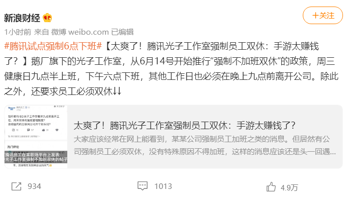 今天腾讯旗下的游戏工作室光子工作室将推行强制双休和节假日休息制度,并且每周三不得加班,其余工作日要在九点之前下班。该消息迅速冲上了微博热搜头条,如果不是亲眼所见,我还以为是谣言呢。