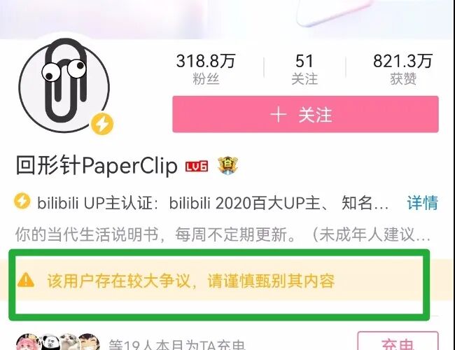 哪怕在网友们的滔滔舆论压力之下,B站也只是标注了回形针的账号是“该用户存在较大争议,请谨慎甄别其内容”的标签,并没有封 号!