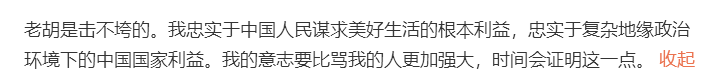 写到这里,老胡也觉得听众可能难以理解他那高深的打脸哲学。被打脸怎么还不能还手呢?老胡说,“如果有谁理解不了老胡这段话的逻辑,体会不到打太极、搞战略大周旋其中的妙处,那没关系,大家慢慢就会懂得”。