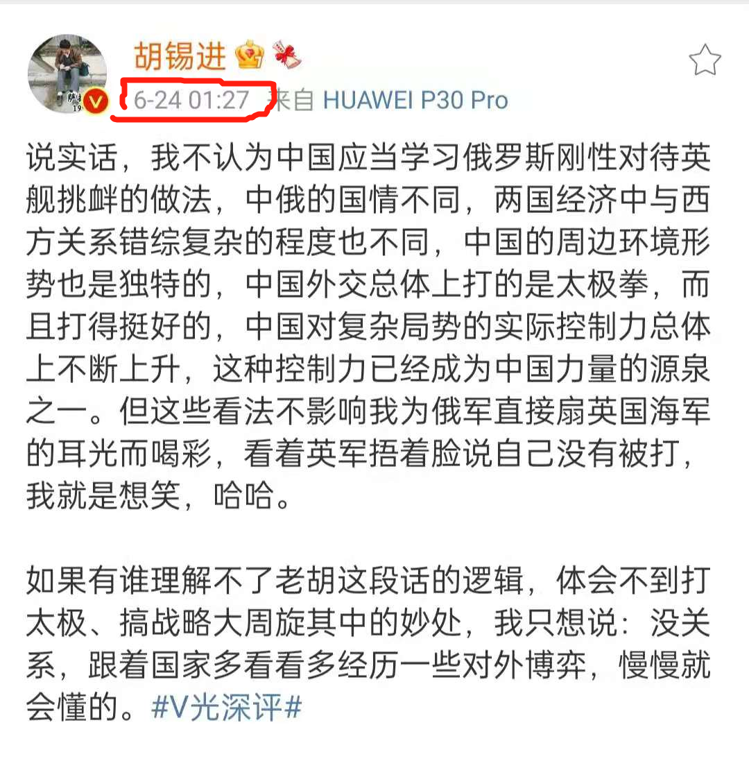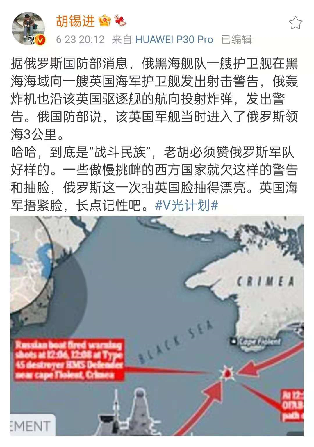 昨天英国军舰在黑海碰瓷俄罗斯,遭到武力驱离。老胡激动的连发三条微博。
