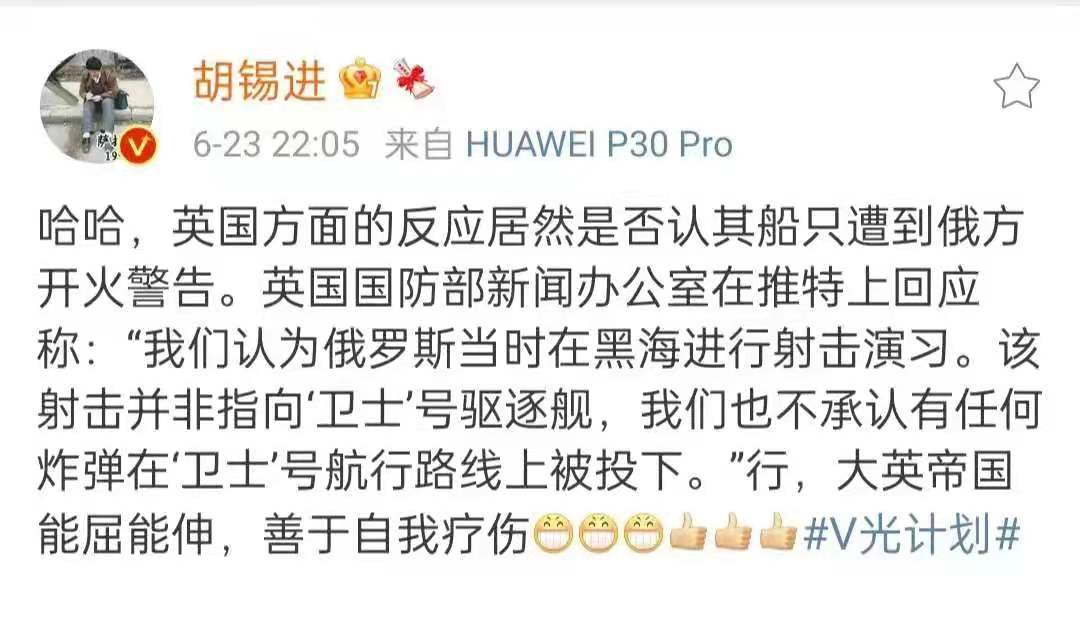 前几天,英国际军舰在黑海碰瓷俄罗斯,遭到武力驱离。《环球时报》主编胡锡进忍不住连连喝彩,就好像是他把英国佬赶跑的,狠出了一口恶气。