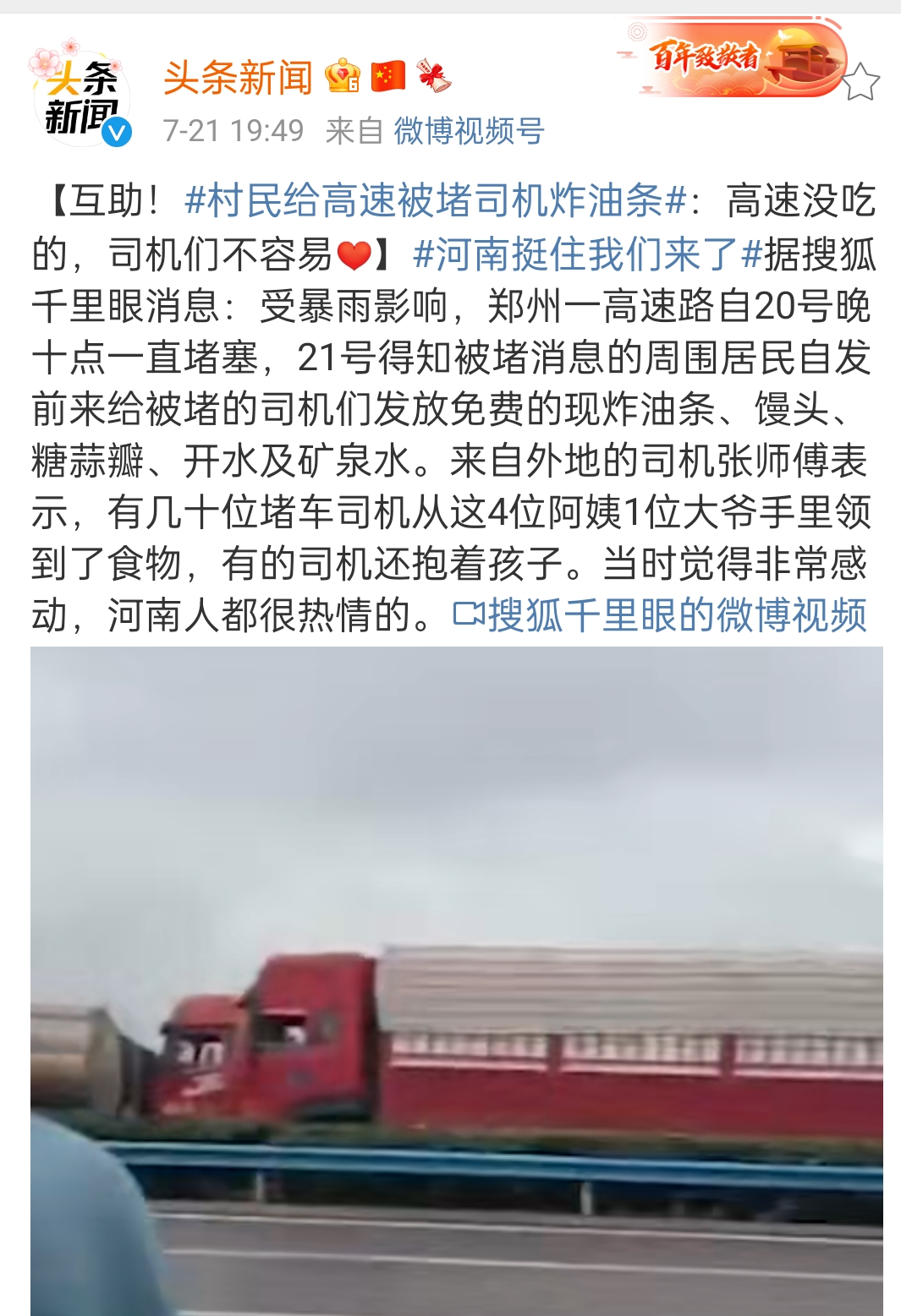 高速路被堵塞,附近村民得知消息之后自发为司机们送来现炸油条、馒头开水等食品,解了燃眉之急。天灾无情,但司机们感受到了河南老百姓的热情。
