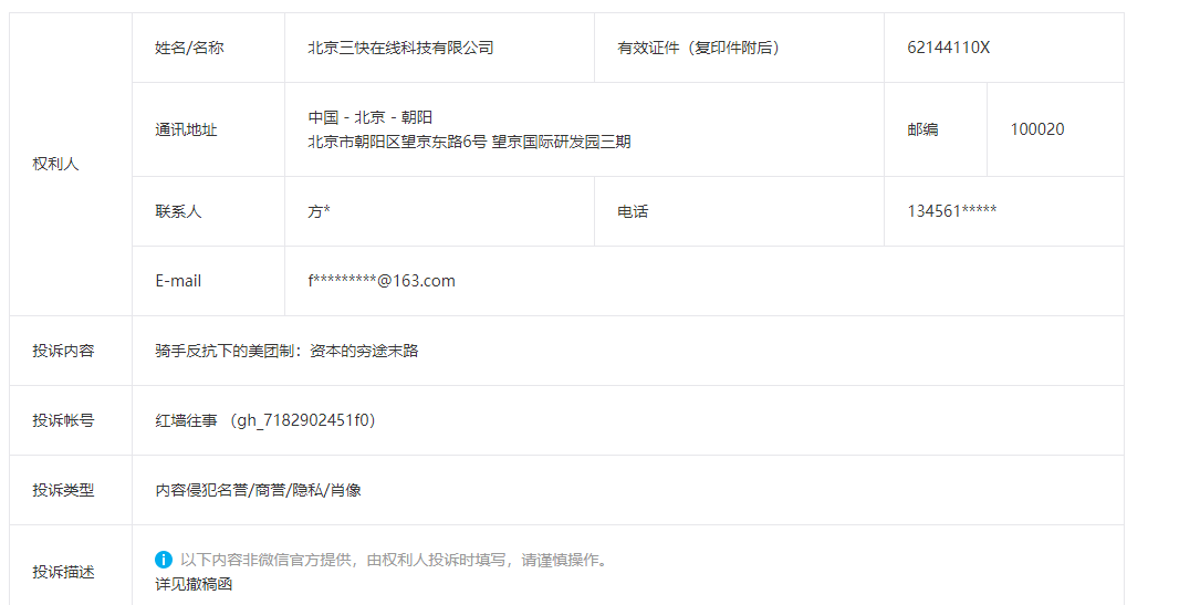 没想到这样一篇阅读量没有过万的文章竟然进入了资本的视线。昨日,公众号遭到北京三快在线科技有限公司(美团)投诉,称《骑手反抗下的美团制:资本的穷途末路》一文内容侵犯名誉/商誉/隐私/肖像。