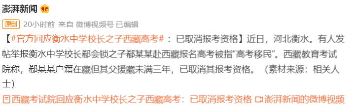 近日,河北衡水中学校长郗会锁违规为儿子办理西藏的“高考移民”资格被举报,受到网友关注。