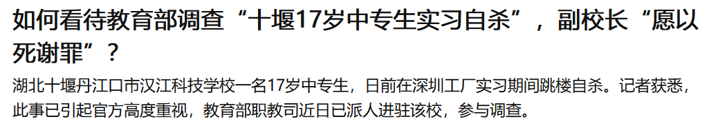 6月25日,刚过17岁生日不久的汉江科技学校的实习生小余在深圳的工厂被逼跳楼自杀。事件发生之后,学校做贼心虚,匆匆结束了“实习”。此事在网络发酵之后,教‘育’部派出了调查组,该校副校长还声称“事情查明,愿以死谢罪”。