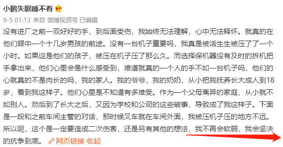 导读 19岁实习生的手掌卷进机器,资本家为保机器导致学生手掌被压1个小时,之后倒开机器造成二次伤害。学生手掌残废,维权却遭学校和工厂踢皮球。
