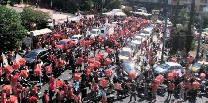 希腊全体工人战斗阵线的组织成员——餐饮-旅游-酒店工人工'会在希腊各地组织了大罢工。成千上万辆摩托车和电动车组成的车队在街道上呼啸而过,骑手穿着 eFood 员工服装,举着eFood的外卖箱以示抗议。在雅典,他们还抗议政府通过新的反劳工法律。